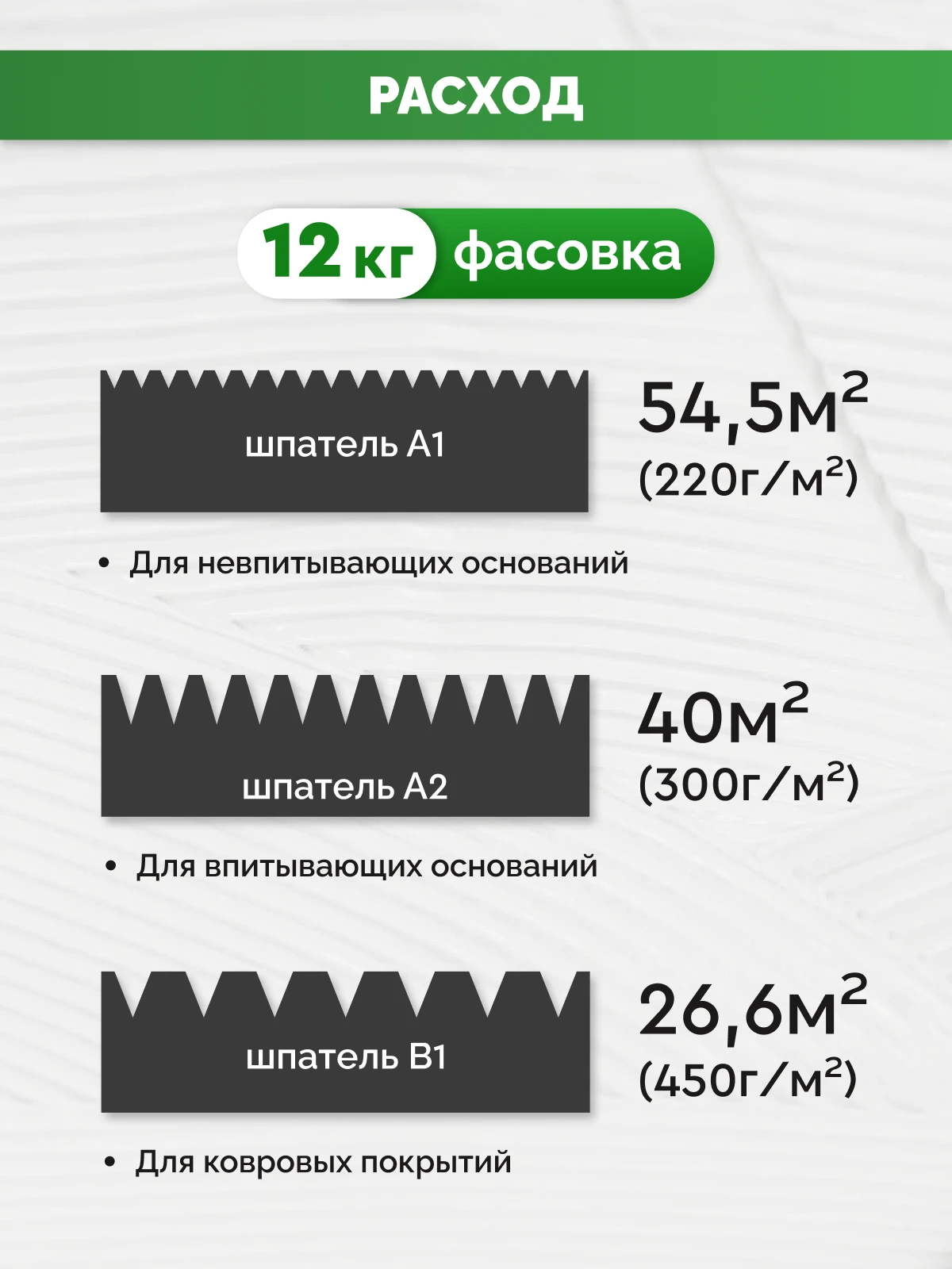 - РасходШпатель A1, А2, В1 Расход: 200–450 г/м2