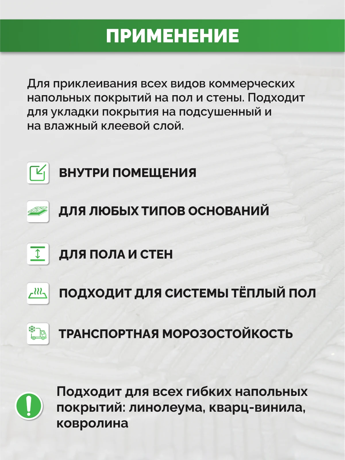 Совместимые покрытия равномерно проводят тепло, обеспечивая комфорт и долговечность, идеально подходят для использования как с водяными, так и с инфракрасными системами подогрева пола..