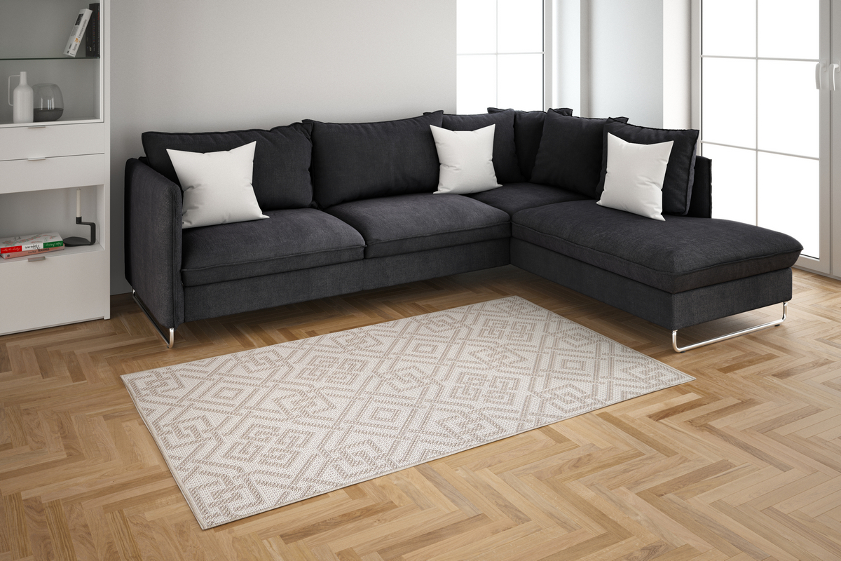 Коллекция Санторини - новая трехуточная циновка с разнобразными дизайнами, подходящими любому интерьеру. Хорошо смотрится в интерьере, ее тяжело запачкать, легко чистить, она долговечна и износоустойчива.
