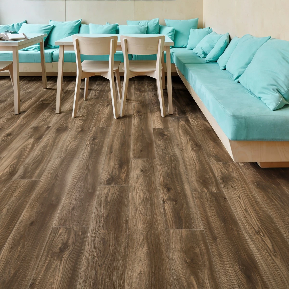 С фаской 4V: срез по всем четырём краям каждой панели создаёт V-образные канавки. Это придаёт покрытию натуральный вид доски и скрывает мелкие неровности основания. Подходит для помещений с интенсивным использованием.