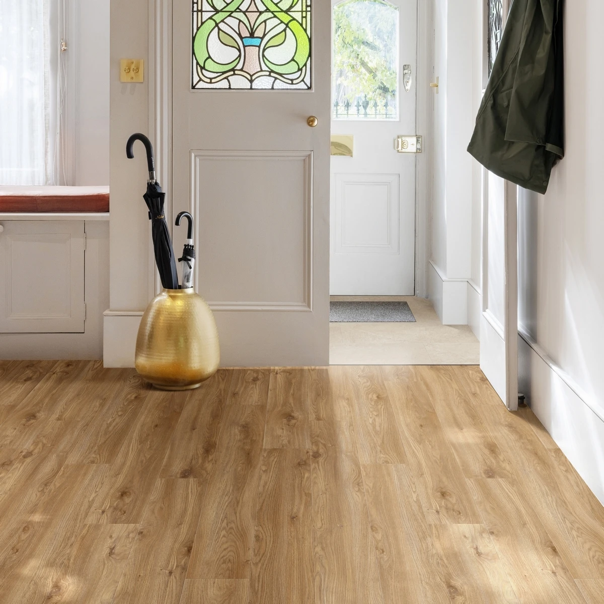 С фаской 4V: срез по всем четырём краям каждой панели создаёт V-образные канавки. Это придаёт покрытию натуральный вид доски и скрывает мелкие неровности основания. Подходит для помещений с интенсивным использованием.