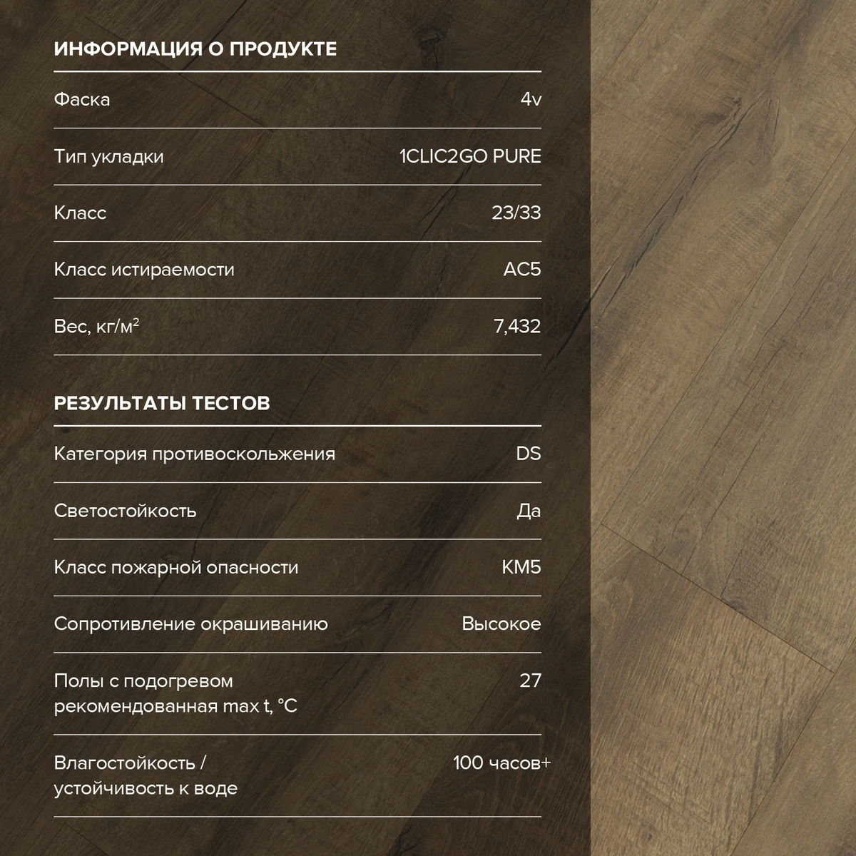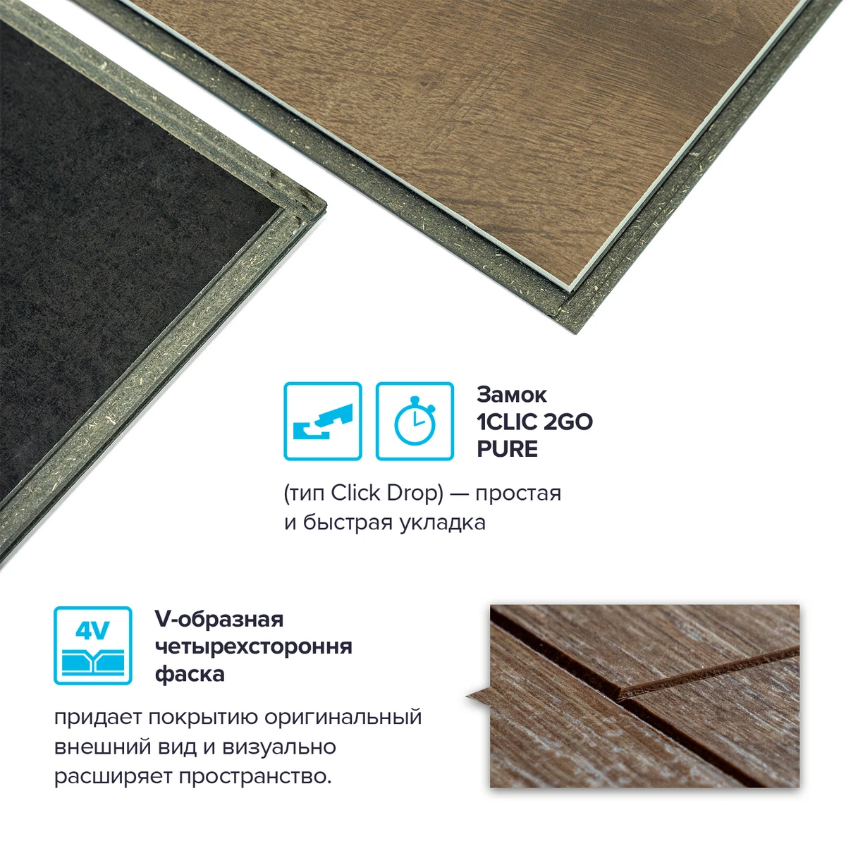 С фаской 4V: срез по всем четырём краям каждой панели создаёт V-образные канавки. Это придаёт покрытию натуральный вид доски и скрывает мелкие неровности основания. Подходит для помещений с интенсивным использованием.