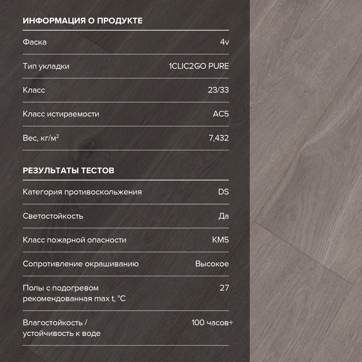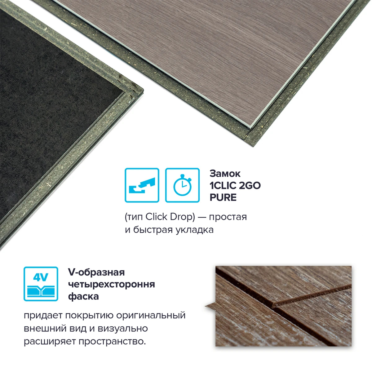 С фаской 4V: срез по всем четырём краям каждой панели создаёт V-образные канавки. Это придаёт покрытию натуральный вид доски и скрывает мелкие неровности основания. Подходит для помещений с интенсивным использованием.