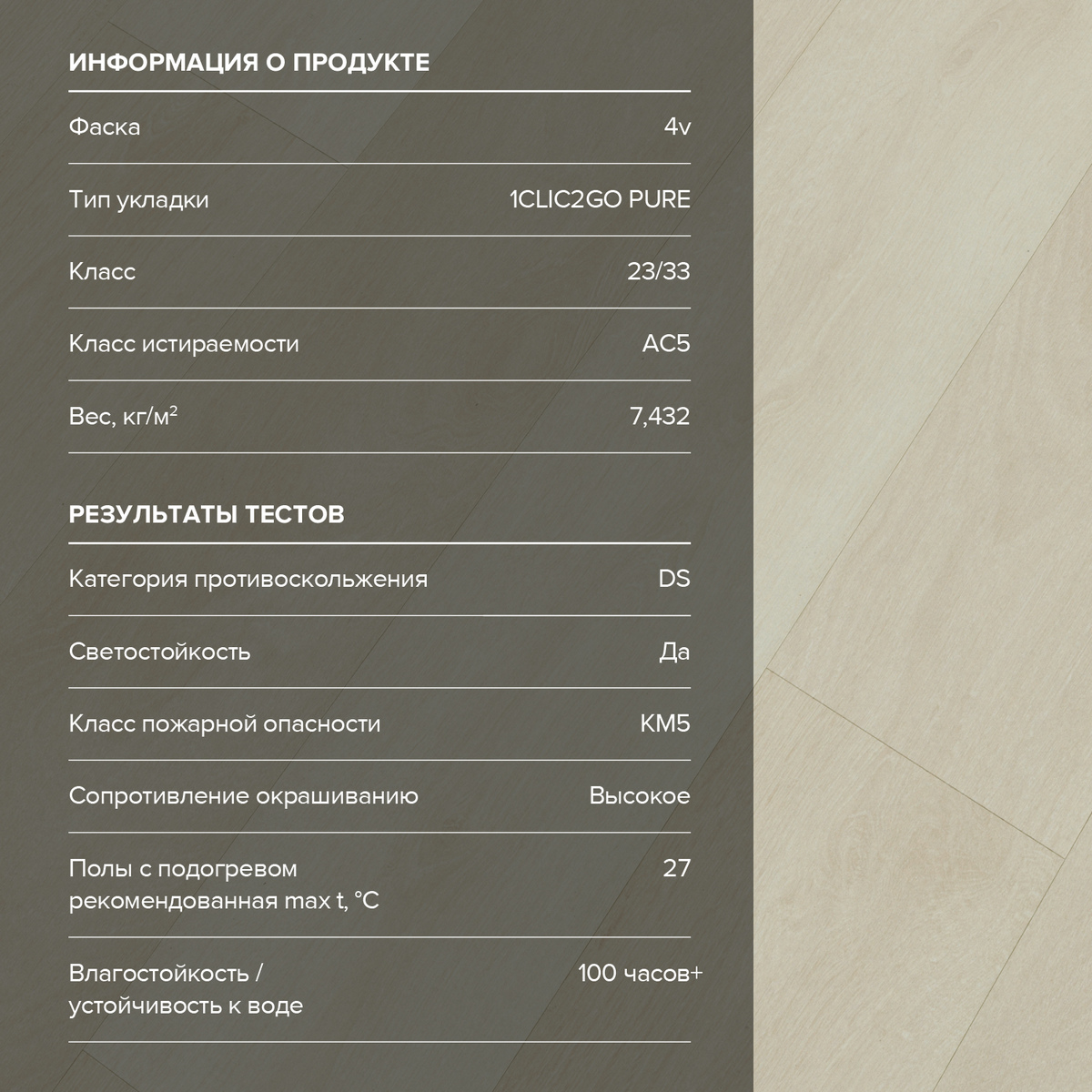 С фаской 4V: срез по всем четырём краям каждой панели создаёт V-образные канавки. Это придаёт покрытию натуральный вид доски и скрывает мелкие неровности основания. Подходит для помещений с интенсивным использованием.