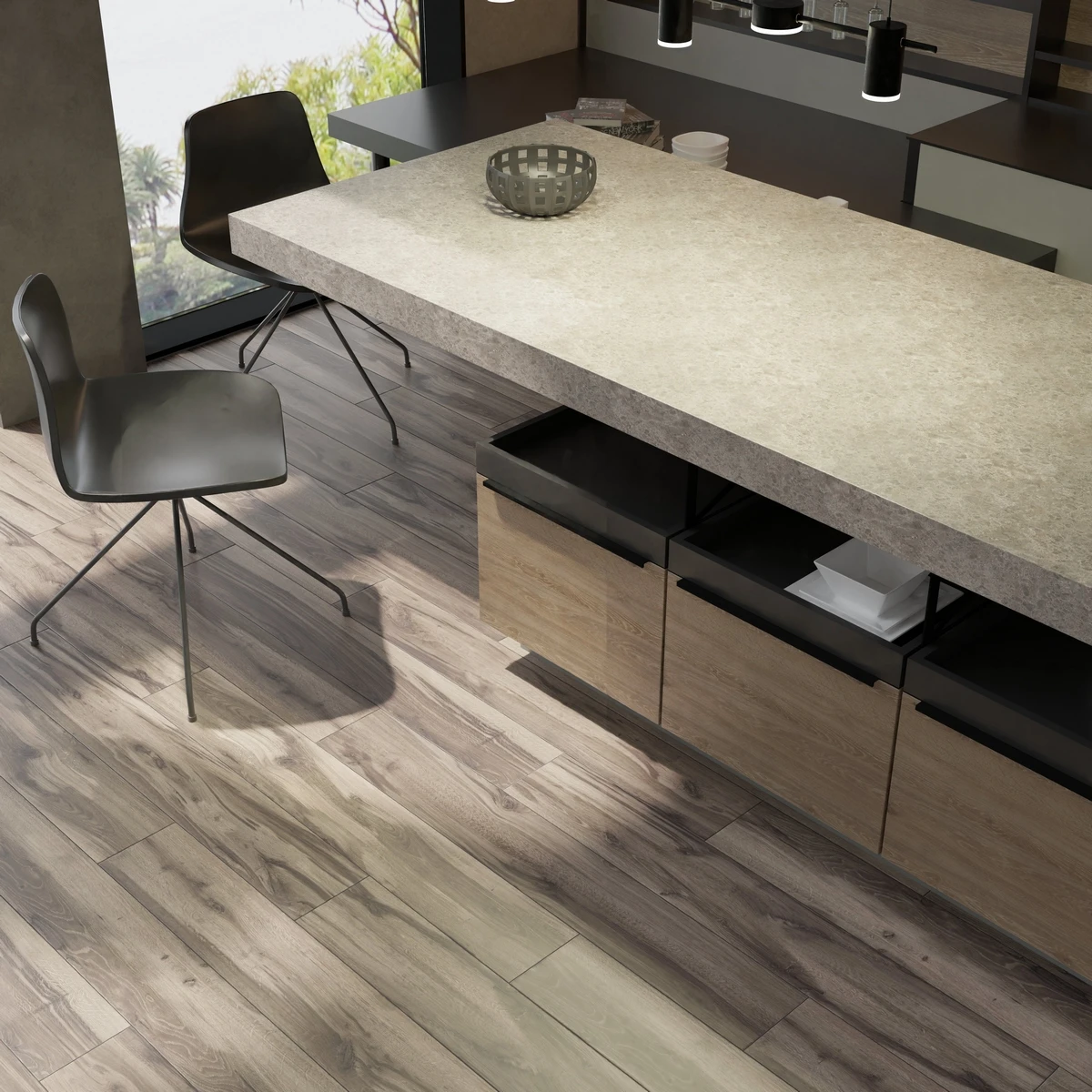 С фаской 4V: срез по всем четырём краям каждой панели создаёт V-образные канавки. Это придаёт покрытию натуральный вид доски и скрывает мелкие неровности основания. Подходит для помещений с интенсивным использованием.