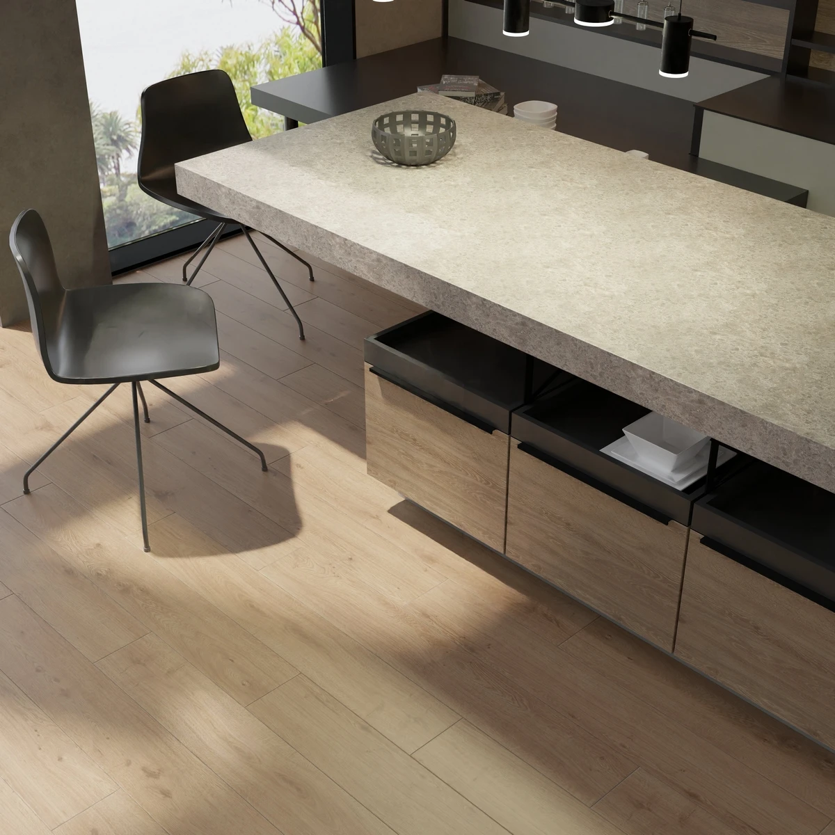 С фаской 4V: срез по всем четырём краям каждой панели создаёт V-образные канавки. Это придаёт покрытию натуральный вид доски и скрывает мелкие неровности основания. Подходит для помещений с интенсивным использованием.