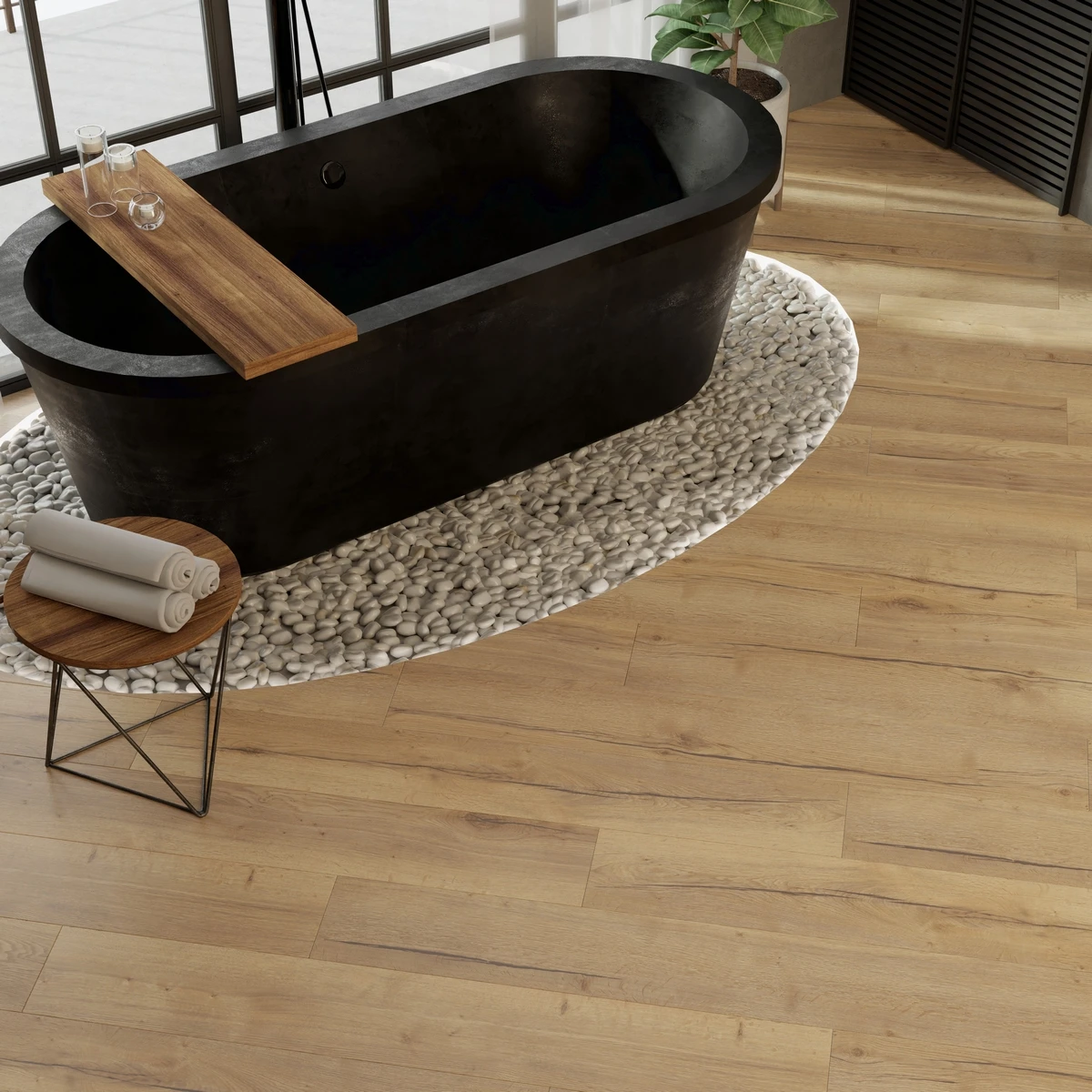 С фаской 4V: срез по всем четырём краям каждой панели создаёт V-образные канавки. Это придаёт покрытию натуральный вид доски и скрывает мелкие неровности основания. Подходит для помещений с интенсивным использованием.