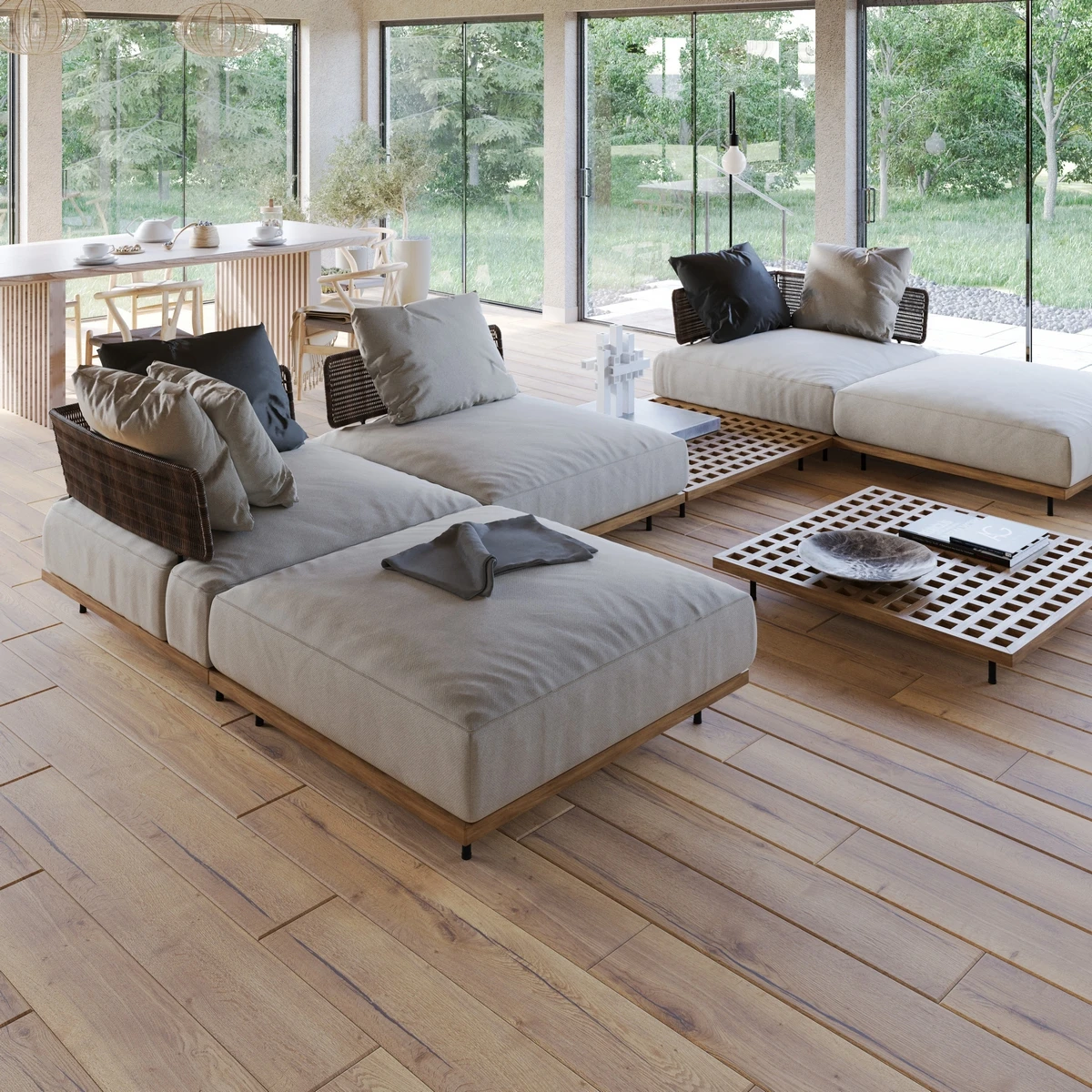 Без фаски: панели плотно прилегают друг к другу, создавая ровную поверхность без видимых швов. Идеально подходит для современных интерьеров, придавая полу однородный вид.