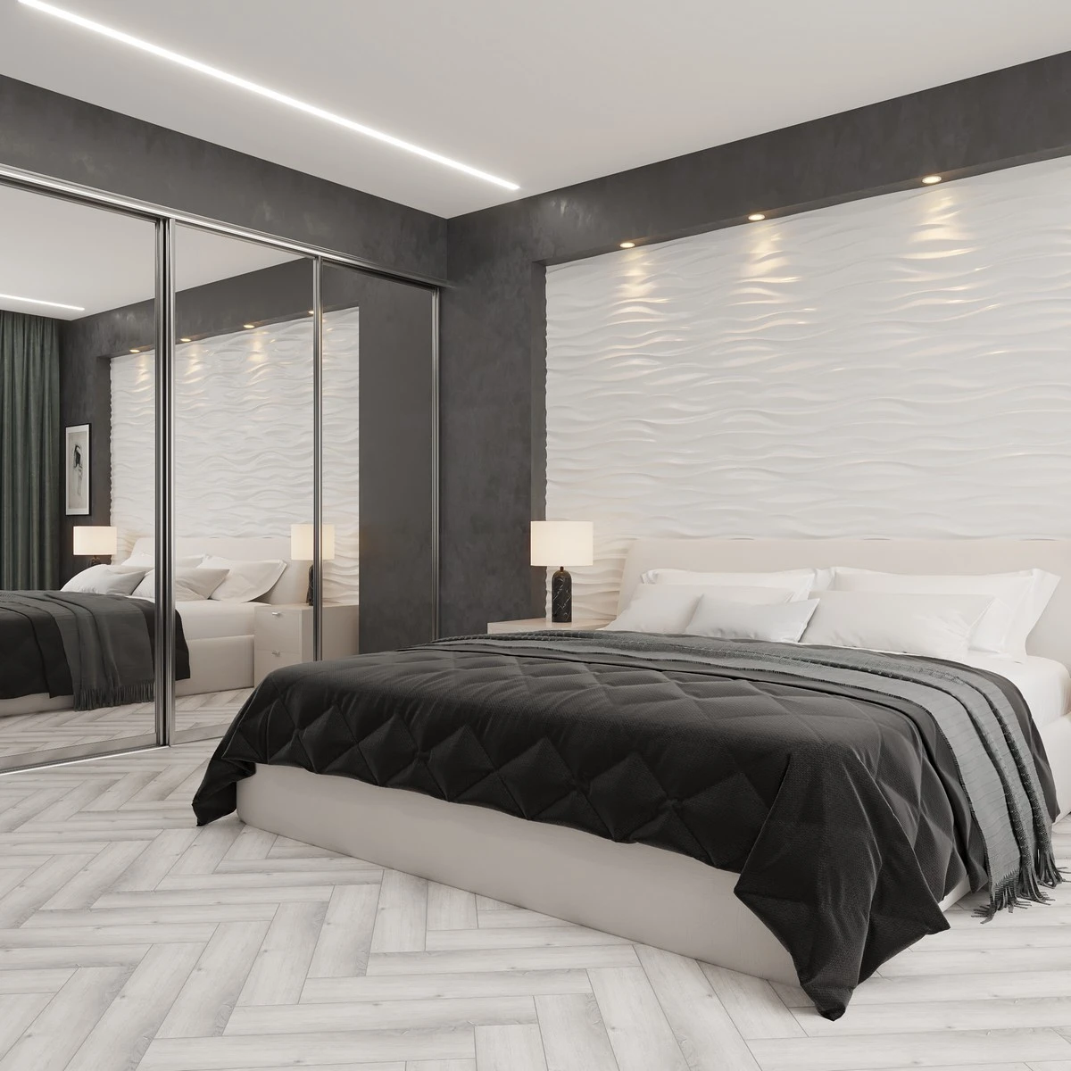 С фаской 2V: срез по двум длинным сторонам панели. Такой тип фаски создаёт продольные канавки, визуально удлиняя пространство. Идеально для узких помещений, добавляя ощущение глубины.